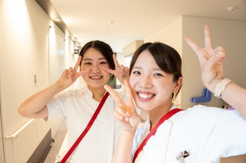 井上さん:同じフロアで働いているので、たまにすれ違う時に笑顔を交わしたり、 声を掛け合ったりして…顔を見るだけでも元気が出ます!あと、二人とも病院の寮に住んでいるので、ちょっと困ったことや悩んだ時にも3秒とかで会いに行けるっていうのは心強いですね!